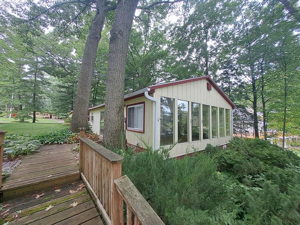 Year around home or a weekend get a way located on all sports Five Lakes. Home offers an attached 2 car garage, one bed and one bath. Wide open floor plans makes for a ton of possibilities of creating more rooms if desired along with a four season room and a wall of windows overlooking the lake. All listing info/measurements are approx