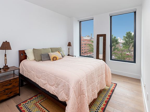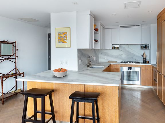 This stunning new development condominium offers west-facing river and skyline views, brilliant light, incredible sunsets, and high-end finishes throughout. Enjoy a spacious living/dining area, oversized chef's kitchen with Gaggenau appliances, marble countertops, wine storage, and custom cabinetry. Both bedrooms are generously sized, with the primary suite featuring a spa-like bath with radiant heated floors and custom closets. Additional features include wide-plank white oak herringbone floors, multi -zoned central AC and washer/ dryer in unit.