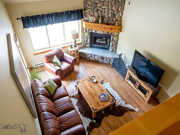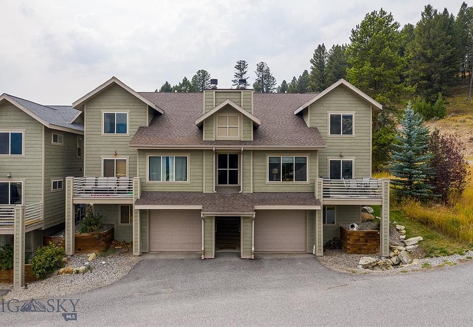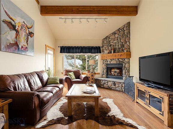 Welcome to your special retreat with expansive views overlooking Town Center and the Gallatin Range. This well-maintained condominium features 2 bedrooms with bonus bunk room, three full bathrooms, and a garage to store all your adventure gear. The top floor master suite features a luxurious master bath with gorgeous tiled shower and glass door, private loft office area/second living space and large master bedroom with closet. The main floor features an open concept plan including a kitchen with stainless steel appliances, spacious island with barstool seating, dining area, and living room with wood burning fireplace. Also located on this level are porches on the front and rear of the home to enjoy those amazing views. This home comes fully furnished, minus just a few exceptions. This front row, end unit Deer Run condominium will not last long, call today for a tour!