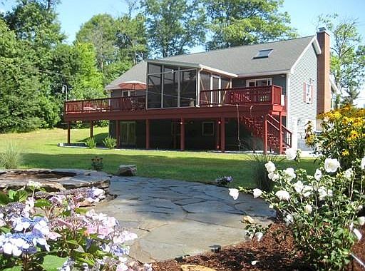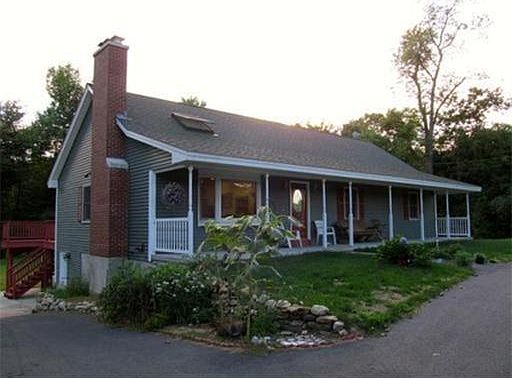 FARMER'S PORCH RANCH (7 yrs old) w HANDICAP DOORWAYS, HALLWAYS AND ACCESS**one level bright open floor plan w 2 skylights ***DETACHED GARAGE/BARN, PERFECT FOR SMALL BUSINESS OR WORKSPACE.(could park 15 cars if needed ***Bow window + brick fireplace w custom wood mantle in LR *** Formal DR w slider to 50 ft deck and screened-in porch***Granite counter kitchen/ S S Appliances/ Oak cabinetry/disposal***Great sized bedrooms because of 28' depth to home. Hardwood throughout. The full walkout basement w rigid +fiberglass insulation+ & plumbed for a full bathroom +wood stove hookup***Sprawling country setting with easy maintenance***The outdoor living wraps around front porch & deck to rear custom stone fire pit w 130 sf blue-stone patio w custom fireplace for entertaining***PERFECT FIRST time or LAST time owner home. YOUNG HOME offers flexible living. Barn/garage has plenty of space for car & 2 work rooms w wood stove***12 -15 minutes to Mass Pike/ Rt 290