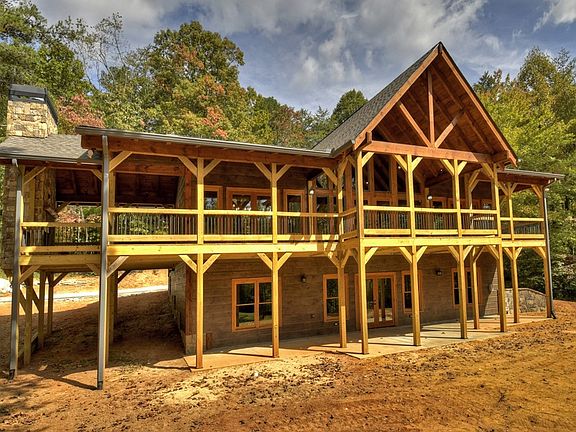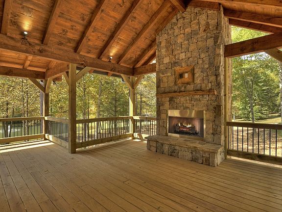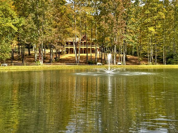 Big Sky Modern Rustic Retreat in Serene Setting Overlooking Beautiful Pond. 3br/3.5ba w/detached 2 car garage/concrete drive. Main level offers great room w/wall of windows/2 sided stone fireplace/cathedral ceilings/spacious gourmet kitchen w/custom cabinetry/upgraded granite CTs/gas cooktop/duel ovens/ample dining space/walk in pantry/laundry room/half bath/master suite w/custom roll in tile shower/separate soaking tub/double vanities. Lower level offers game room w/wet bar/stone fireplace/2 guest bedroom suites. Wood floors throughout. All complete w/2 levels of massive outdoor living inc. covered porch spanning length of home overlooking pond + massive party porch w/3rd fireplace, lower level concrete patio. All usable gentle terrain. Coveted location in gated paved community w/access to 2 Stocked Ponds (one w/Fountain & Waterfall), Gazebo (Picnic Area) & Hiking Trail, Underground Utilities. Nestled Against the Cohutta Wilderness Area Access within minutes of Blue Ridge!
