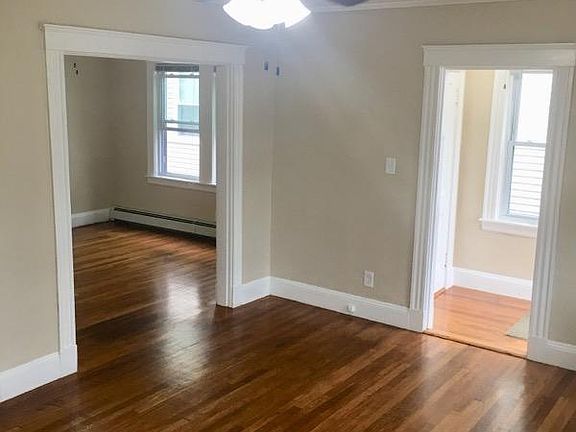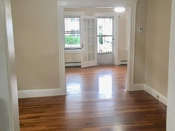 Completely rehabbed with beautiful and gleaming hardwood floors throughout. Back porch and front porch with 2 off street parking spaces. Huge walk in closets, both bedrooms about the same size. Wide staircase for those who have larger furniture pieces. Giant living room opens up to a formal dinning area; or relax and have dinner in your eat in kitchen (EIK) with tile floors, new appliances (dishwasher, disposal, fridge, range), new cabinetry and nice ceiling fan. Tons of windows (double-paned) lets light stream throughout this top floor apartment. Redone bathroom with gorgeous tile throughou Great location - side street, yet close to everything. Walk to shops, coffee, restaurants, public transit, express bus downtown, Newton, mass pike, Waltham.