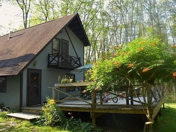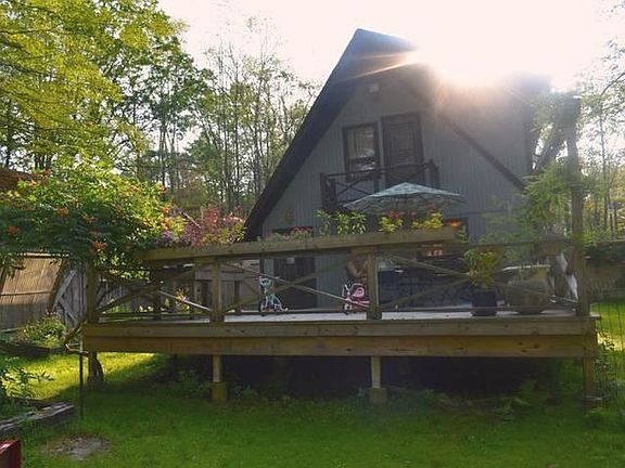 Looking for a private property close to outdoor activities like hunting, fishing, boating & golf? This charmer is situated on 2.67 private acres near one of the area's most popular campgrounds. Outside you will find a wooded lot, fenced in back yard with large deck, a garden, & a large barn with carport. Step inside & you will immediately appreciate the love & attention to detail that has been given to the home. The living room was recently updated with new drywall, lighting, & flooring. You will enjoy the wood burning stove on those chilly fall evenings & through the holiday season. There is a large eat-in kitchen & laundry room. Upstairs you will find two spacious bedrooms - both with ample storage. Additional updates include Pex plumbing, electrical upgrade to allow for a direct generator connection & well pump (2021). This home could be year-round living, seasonal, or a great AirBnB. Call today!