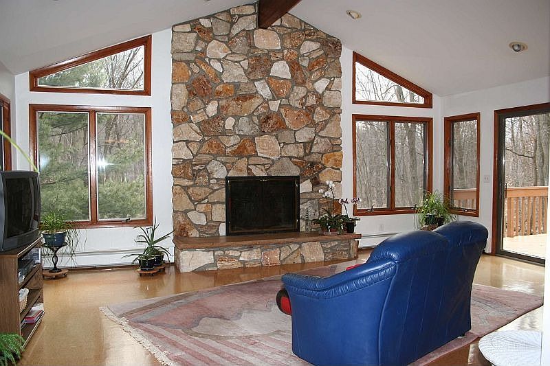 Half acre level property! Unique, expanded, contemporary style home with many updates. Four bedrooms, three full baths, hardwood floors, remodeled kitchen. Vaulted ceilings in kitchen, living room, dining room and great room. Great room features skylights, stone fireplace and sliders to large deck. Master bedroom was expanded and has a large walk-in closet, new master bath with tiled shower! Walkout lower level. Baseboard heat, central air! Septic updated.