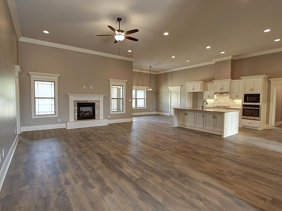 All brick Hamilton Plan B is an open plan with a 3 car side entry garage backed by a 2-10 home warranty.. UPGRADES:NO CARPET - REV-WOOD in all bedrooms.Gas Cook Top with Double Oven Package.Soft Close Cabinets.Granite in all bathrooms.Under cabinet lights.Home has 4 bedrooms, 3 baths. Great Room features 12' ceiling, extensive trim, gas-log fireplace with raised stone hearth, wood plus flooring and recessed lights and ceiling fan. Dining room has 12' coffered ceiling, wood plus flooring, extensive trim including shadow box under chair rail. Kitchen includes 9' ceiling, custom cabinetry and granite counter tops, large island with raised bar seating, stainless appliances including dishwasher, gas cooktop, wall oven and wall microwave, tile backsplash, tile flooring, recessed lighting, and huge walk-in pantry. Breakfast has 9' ceiling, tile flooring and extensive trim. Laundry has custom cabinet, tile flooring. Master bedroom has 9' ceilings plus a double tray, recessed lighting, extensive trim and ceiling fan. Master bath has 11' ceilings, glamour tub with tile surround, large tile shower with tile bottom and rimless shower door, separate toilet area, double vanity with granite counter tops and large walk-in closet. The additional bedrooms have ceiling fans and crown molding. Home has large rear covered porch perfect for entertaining. Optional Open Kitchen has 12' ceilings in kitchen and breakfast area, large island with extra storage and countertop seating and includes