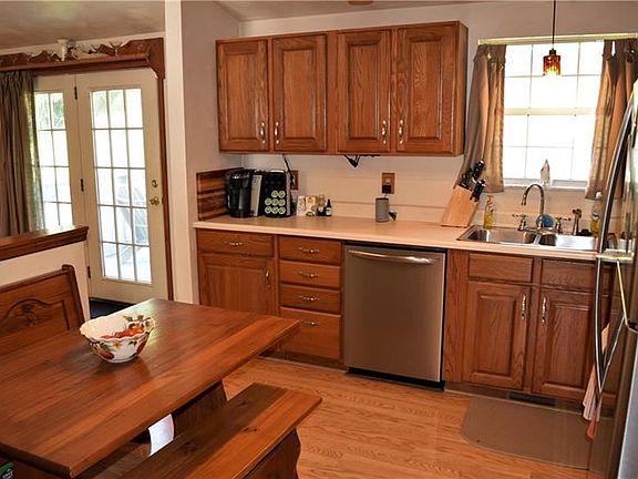 This great home is tucked away on a quiet street yet convenient to town, shopping, dining and the courthouse. The kitchen boasts wood cabinets, includes all appliances and a custom, corner table and benches for casual dining. The kitchen is open to the formal dining room w/ sliders to the deck for outdoor dining. The dining room also opens to the living room with cathedral ceiling and large picture window offering natural light. The nice size master bedroom features a full bath. 2 additional bedrooms and a 2nd full bath with skylight are also offered. The lower level game room is a great space to relax or entertain guests at the beautiful bar area. A half bath and laundry room are also offered in the lower level. A 2 car garage is a plus! You'll love the nice landscaping, deck, level yard and landscaped, terraced upper yard lined with trees.