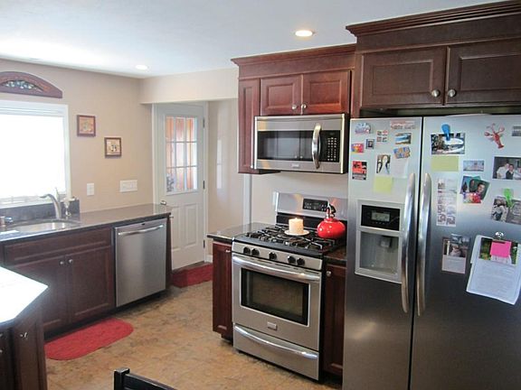 You'll love this remodeled home! Stamped concrete driveway, sidewalk ,stairs,and patio. Newer architectural roof, siding, & windows! electric panel upgraded to 200 amp to allow for a new Kitchen with soft close cherry cabinets and granite countertops, newer gas boiler for heating system with added insulation, Additional room in the partially finished basement with electric baseboard heat and full bath.Sit back and watch your bushes grow for additional privacy.