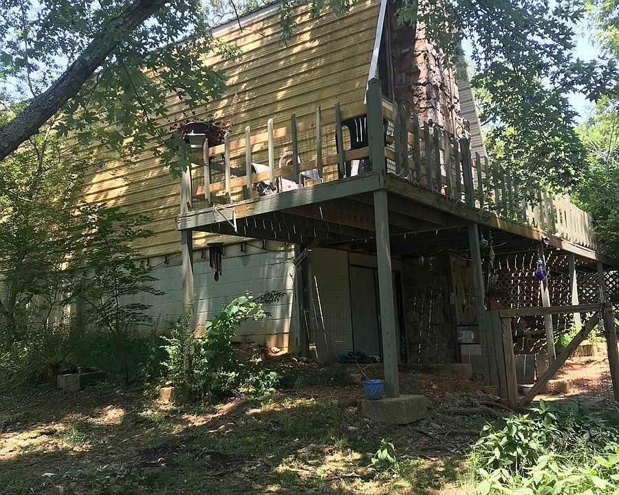 Unique and cute would be good descriptive for this well-built home in the country. Steel beams create the skeleton for this unusual A-frame type structure with metal siding. The main floor has living spaces like kitchen, laundry room and large pantry, full bathroom, and family room with fireplace. There are 2 bedrooms upstairs with a half bath on that level. In the walk-out basement is the master bedroom with walk-in closet, jacuzzi tub full bath, and a sitting area. Be aware that the house has lots of steps but yard area around house has gentle topography. House is solidly built but needs updates to floor coverings and ceilings. The 2-car garage with concrete floor is attached to house by breezeway. There is also a small shop and an equipment shed to store your tools and tractor. The property is well situated for ease of access to Buffalo National River, Bull Shoals Lake, and White River for excellent fishing. Wooded lot behind house could meet your hunting needs for deer. There are apple and plum trees of bearing age and many flowering plants and herbs. The unrestricted almost 3 acres has room for garden and livestock to complete your country experience. $129,000