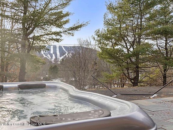 The well-appointed kitchen is designed with both functionality and style in mind, featuring granite countertops, hickory cabinetry, and a full suite of stainless-steel appliances. Sliding glass doors lead to a bluestone patio with a new hot tub, perfectly positioned to relax and take in the picturesque views of the Windham ski slopes and surrounding mountains.