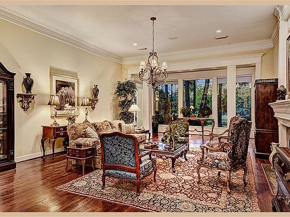 Waterfront 1.5 story John Post custom home on an oversized lot in Panther Creek-central location! Charming covered front porch, hardwood & tile flrs, stunning trim work, built-ins & walls of windows provide serene lake views thruout. Island kitch w/granite counters, bkfast bar & dbl oven opens to bkfast & den; both formals; 3 generous bdrms dwn; 1 bdrm & flex rm up (could be media, gamerm, exercise rm); fenced yard w/covered patio & sparkling pool; 3 car oversized garage & 2 car porte-cochere.