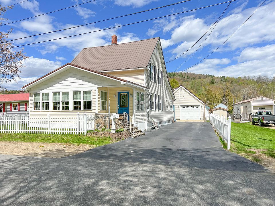 Welcome to this charming Cape-style home offering comfortable living and inviting outdoor spaces! Boasting three bedrooms and one bathroom, this residence presents a convenient layout ideal for easy living. The first floor welcomes you with a delightful three-season front porch, providing additional space for relaxation or entertaining. The updated kitchen and dining room feature modern amenities and a cozy pellet stove, perfect for chilly evenings. The primary bedroom, living room, and bathroom complete the main level, offering the convenience of one-floor living. Upstairs, discover two bedrooms and an office space or guest room, providing versatility to suit your needs. Outside is highlighted by large planters and a paver patio, ideal for enjoying the fresh air and hosting gatherings. Ample storage options include a shed, she shed, and one-car garage, ensuring plenty of space for your belongings. A well-maintained paved driveway adds convenience, while the proximity to the local trail system and Swift River offers opportunities for outdoor recreation, including swimming and exploration. Don't miss the chance to make this lovely property your new home!