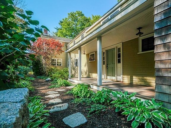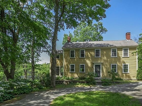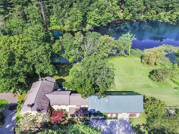Stunning setting for this 1814 farmhouse w/ gently sloping lawn on pond - 15 mi from Boston. This is a once in a lifetime opportunity! This amazing light filled home has been thoughtfully updated while maintaining its original charm & character. Enter off front porch into foyer with concrete radiant heated flrs & continue to beautiful updated country kitchen with center island, pantry & built in breakfast area w/spectacular water views. Lg fireplaced living room open to kitchen. Dine in formal DR w/ fireplace. Sunny office w/views . Second floor has MBR & four additional bedrooms + three full bathrooms plus a sitting room. Roof & many windows & systems are newer. Wide planked wood floors and bamboo flooring, 4 fireplaces & double staircases. Complete privacy in the back with stone terrace overlooking the water w/dock and 1.7 acres of pastoral land with stone walls, fruit trees, perennial gardens. Attch'd barn works as a great party space/play area + has 2 horse stalls +storage