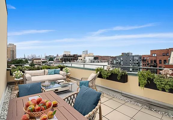 In the Heart of Williamsburg, this gorgeous, loft-like duplex with 2 private outdoor spaces and sweeping Manhattan skyline views is now available. This convertible 3 bedroom /2 bath with impressive 20+ foot ceilings is incredibly bright. Watch the sunset over Manhattan on your own private terrace. The open kitchen has stainless steel appliances and granite countertops flowing into the living/dining area with Brazilian hardwood floors. This magnificent residence truly has it all- double height ceilings in the living area creating a wonderful atmosphere for entertaining, while the mezzanine easily converts to a large third bedroom. This modern walk-up has every amenity expected including central air conditioning, washer/dryer and video intercom while the building also has a furnished roof deck with incredible 360 degree views. Located in the best possible section of Williamsburg just two short blocks from the Bedford L subway station.