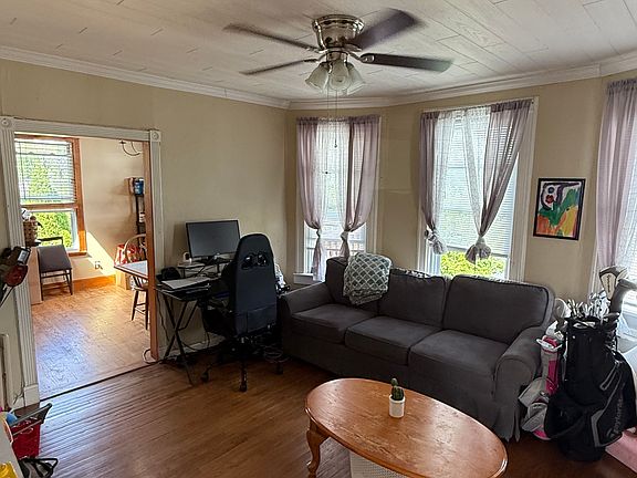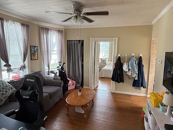 This exceptional space features soaring high ceilings, beautiful hardwood floors throughout, and a distinctive spiral staircase that adds architectural charm. The kitchen boasts a one-of-a-kind design perfect for culinary creativity. Step outside to enjoy a spacious deck and shared yard ideal for relaxing or entertaining. Don't miss the chance to live in a home that's as individual as you are! One year or more! Come and see it today!