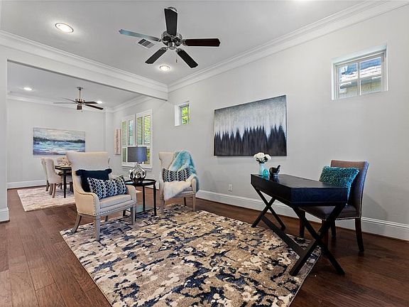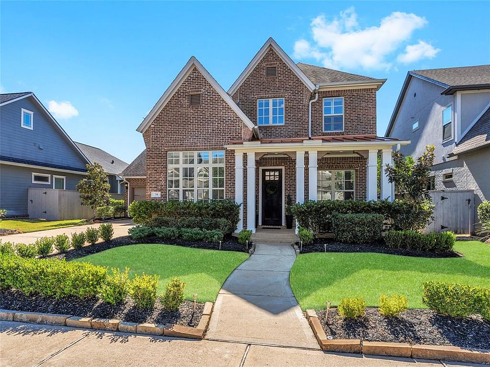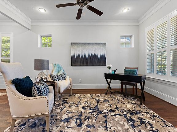 Stunning 5 bedroom and 4 bath home in the highly desirable neighborhood of Liberty Branch in Creekside Park. Great curb appeal with covered front porch and lush landscaping. This fantastic floor plan features wood floors throughout the living areas and bedrooms (with the exception of the carpeted media room), custom shutters, and crown molding. Gorgeous two-story family room open to the gourmet kitchen with white cabinetry, extensive storage, large island, quartz countertops and backsplash, eight burner gas stove, large vent hood and three ovens. Formal living that can easily be converted to a study and formal dining are also located downstairs. Two bedrooms down including a gorgeous primary retreat with a luxurious primary bath and large walk-in closet. Upstairs includes gameroom, media room, three bedrooms and two baths. Other features include outdoor courtyard with iron gate, first floor laundry room with washer, dryer and utility sink. Spacious 3 car garage and covered back patio.