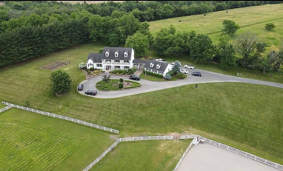This 2-story custom built Southern Colonial style farmhouse sits atop 10-acres with a 5-stall barn, run-in sheds, paddocks, pastures, large riding ring, tractor shed, a garden and a decorative Koi Pond that offers hours of pleasure. Enjoy endless views of neighboring towns as well as Round Valley from the upper porch. A 2 story marble tile entry with curved staircase leads you to the 1st Floor sunken Family Room with floor to ceiling stone LP fireplace, and triple window/atrium door with access to patio; Large eat-in-kitchen has cherry cabinets, granite countertops, SS appliances including wall oven/microwave, cooktop, trash compacter, recently replaced refrigerator, and 2 drawer dishwashers, kitchen access to patio through slider; walk through the Butler’s Pantry to a Large Dining Room with French Doors accessing the front porch; Office with custom shelving and French Doors leads to spacious 1st floor Master Bedroom suite, LP fireplace, large WIC, Master Bath with large jetted tub, separate shower with seat and private water closet, French Doors accessing patio; Laundry/Mud Room with plenty of closet and storage space, French Doors accessing front porch; Powder Room with wainscotting and pedestal sink is directly across from door leading to side porch and exposed breezeway to detached 3 car garage. Access the upper level by the curved entry stairs or use the back staircase off the mud/laundry room. Upstairs are 2 identical bedrooms with built-in bookcases, WIC and private baths. Across the hall is an optional 4th bedroom/gaming room with French Doors accessing the upper porch; TV/Entertainment room with built in shelving has French Doors offering access to the upper porch and double pocket doors for extra privacy. Partially finished basement with double door walk-out access to yard. Double door access to unfinished work area with high ceilings as well as single door access to storage area, separate utility room with additional storage. Owner of this property owns common driveway and solar panels. Home includes additional lightning rods on house and barn, central vac, 200-amp service, roughly 900 sq ft. of patio & walkways, circular drive, 2 zone heat and air-conditioning, 2 Roth oil tanks, invisible dog fence. 5 stall barn measuring 34’ x 48’ with attached paddocks and rehab field, large tack room, feed room with washer/dryer and full staircase to hayloft, 3 turnout fields with run-in sheds