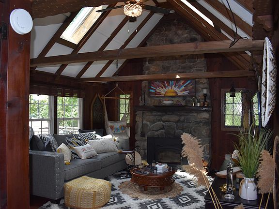 Charming lakestyle log cabin w/original stone f/p, updated kitchen, bath, wood floors, large deck overlooking beautiful yard, c/a, oil heat and full basement, dead end street and very quiet Very bright w/wall of windows in dining room, door to deck, skylight in 2nd floor loft, washer/dryer ok but tenant supplies