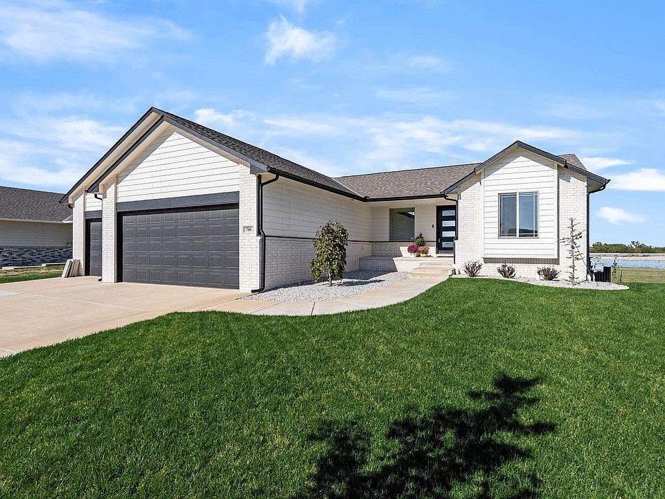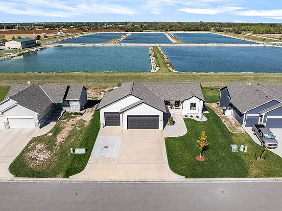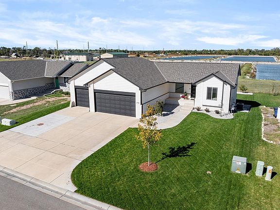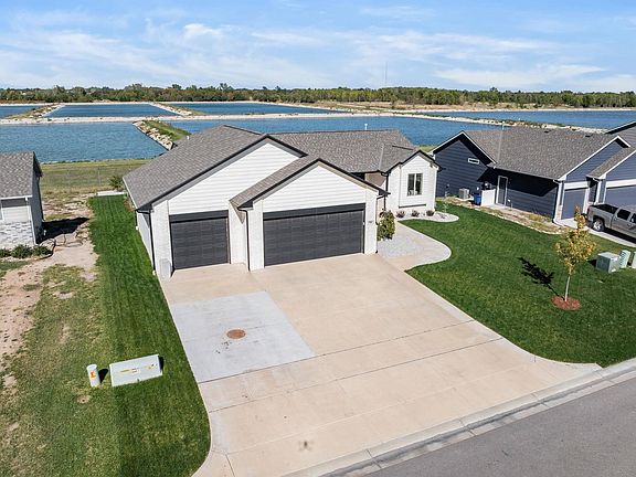 Better than new with a finished view-out basement and peaceful waterfront views, this beautifully designed home in Clover Leaf Farms offers more than 2,650 square feet of thoughtfully planned living space within the highly sought-after Goddard School District. The open-concept main level showcases durable luxury vinyl flooring, vaulted ceilings, and abundant natural light that fills the home with warmth and comfort. The kitchen serves as the heart of the home, featuring granite countertops, an inviting eating bar, a spacious pantry, and stainless-steel appliances that combine style and function. The adjoining dining area flows seamlessly into the living room, creating a welcoming environment that’s perfect for family gatherings, entertaining friends, or simply enjoying everyday life. The split-bedroom layout enhances privacy, with the primary suite tucked away and featuring a large walk-in closet, dual vanities, and a beautifully tiled shower that offers a touch of luxury. The professionally finished view-out basement nearly doubles the living space, offering a large family or recreation room that’s ideal for movie nights, game days, or kids’ play space. Two additional bedrooms, a full bathroom, and a generous storage area make this level as practical as it is comfortable, while oversized windows bring in natural light and capture scenic views of the water behind the home. Outdoor living is just as appealing, with an open deck and fully sprinklered yard that back directly to the water—perfect for relaxing evenings, grilling with friends, or watching the sunset over the pond. Additional highlights include an oversized three-car garage with extra room for storage or a workshop, a full warranty for peace of mind, and neighborhood amenities such as lake access and greenbelt maintenance. Situated on a quiet cul-de-sac just minutes from Tanganyika Wildlife Park, Blast Off Bay Waterpark, and west Wichita’s shopping and dining, this move-in-ready home offers the perfect balance of space, quality, and tranquility in a beautiful waterfront setting.