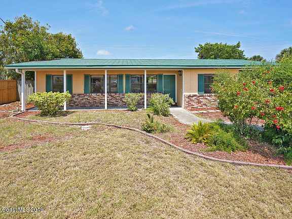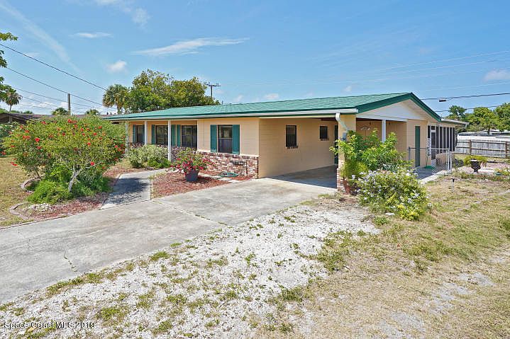 Come and see this wonderful Merritt Island 4/2 with plenty of room to spread your wings. Split floor plan, indoor laundry, dining area with large chandelier, large open family room with a fireplace, kitchen with a window looking out over large backyard, trussed screened back porch and a large front porch to sit and enjoy the neighborhood. Freshly painted on the inside and waiting for new owners to call it their own. Unlike most of the homes in this area of Merritt Island it is NOT in the flood zone. Master bath shower and guest bath tub recently redone. Newer hot water heater and AC and it has a metal roof. BRAND NEW PANEL BOX 6/10/2019.