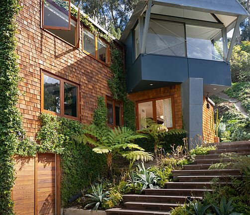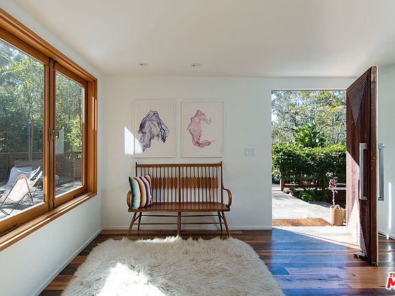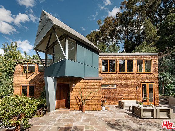 Hidden in the tree tops of Rustic Canyon on the coveted Latimer Rd, this home re-created by Frank Gehry blends architectural modern lines w/ rustic finishes. Entering into a great room that incorporates family living area, eating areas, & extraordinary chef ktchn, the open scale of the home is breathtaking. This ultimate ktchn is built around oversized butcher block & honed Carrara counters feat a wood burning fireplace & accordion glass doors reflecting the natural elements of the hillside gardens. Public areas merge seamlessly w/ outdoor entertainment spaces inc cedar Japanese tub, outdoor fire pit, & dining areas. 4 bed w/ 3.5 ba, an upstairs great room feat. pitched beamed ceilings & wood burning fireplace are all illuminated by handcrafted oversized, wooden framed windows.. Nestled within canyon greenery, privately placed above the street for ultimate privacy, this is an exceptional home for the unconventional buyer searching for the quintessential SM Canyon property.