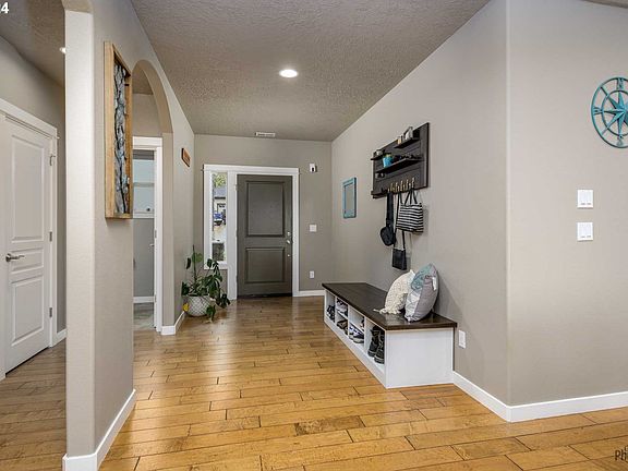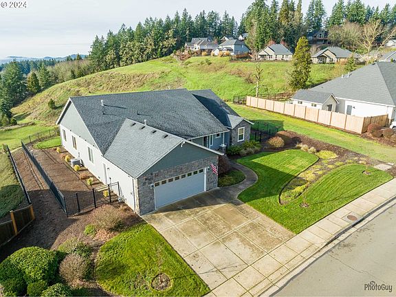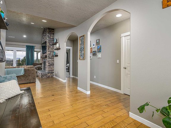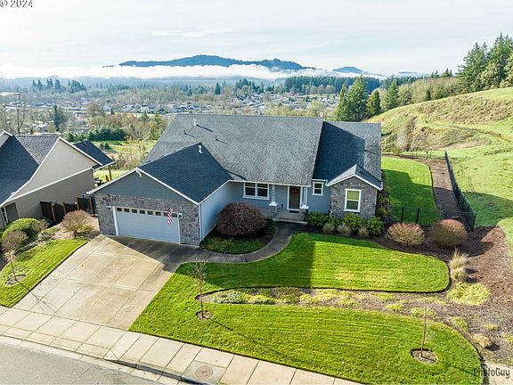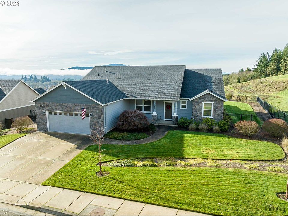 Stunning single level living w/ VIEWS in coveted Mountaingate! Approximately 2,616 square feet offers 3 Bedrooms, 2 and a half Baths, an office, a den & fantastic open concept kitchen & living area gathering all the views! Great separation of space throughout the home boasting vaulted/high ceilings, hand-scraped engineered hardwood floors & gas appliances! Kitchen offers Granite surfaces, an eat bar and pantry. Open Living room with beautiful stone fireplace & french doors to back covered patio with views. Primary bedroom with expansive suite including dual sinks, walk-in shower with dual heads, soak tub and deep oversized walk-in closet! Laundry units, Fridge, kitchen wine cooler & hot tub are included. Perfectly situated on a large .28 acre lot with expansive views and extra deep 2 car garage! Enjoy proximity to nearby recreational opportunities including plenty of new Willamalane Hiking & mountain bike trails, Willamette & Mckenzie river access & Mt. Pisgah!