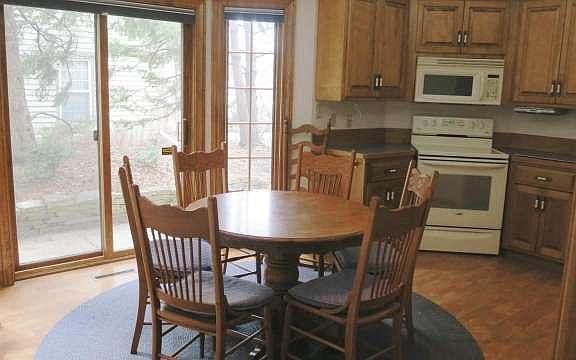First floor unit with large eat-in kitchen and dining room. Large great room with gas fireplace wood flooring. Master bedroom with walk-in closet Master bathroom newly remodeled with large walk in shower. 2nd full bath off halway. Granite in kitchen. Front and back entrance's. privat patio. Storage locker in lower level.