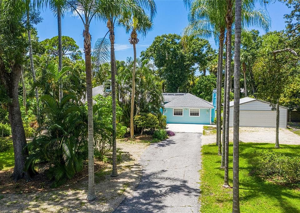 One or more photo(s) has been virtually staged. Discover a tropical Key West-style retreat on OVER AN ACRE of lush, fully fenced land, perfectly situated on a private dead-end street in the heart of Sarasota. NO HOA and NO CDD. This beautifully maintained 3 bedroom, 2 bath home features real wood floors, soaring ceilings, and abundant natural light from clerestory windows and skylights. The large open floor plan includes a bright updated kitchen with Silestone countertops, stainless steel appliances, and neutral white cabinetry, along with a dining area and cozy breakfast nook. A spacious converted garage serves as a family/game room with a wood-burning fireplace, perfect for entertaining. The primary suite offers patio and pool access, high ceilings, and an updated en-suite bathroom with a dual vanity, enclosed water closet, and walk-in closet, while split-plan guest bedrooms include walk-in closets and laminate flooring. Outside, enjoy a screen-enclosed pool surrounded by breathtaking tropical landscaping, including mango, banana, and pineapple trees. Plenty of parking for your RV, boat or guests. Recent upgrades include a 2024 dishwasher 2023 refrigerator, 2024 pool pump, and front wood railings, as well as a 2022 water softener, 2021 A/C units, a septic tank replacement, and updated electrical service. With a detached 2-car garage, a powered storage shed, and proximity to downtown Sarasota, I-75, and Lido Beach, this private oasis combines seclusion and convenience. Schedule your showing today!