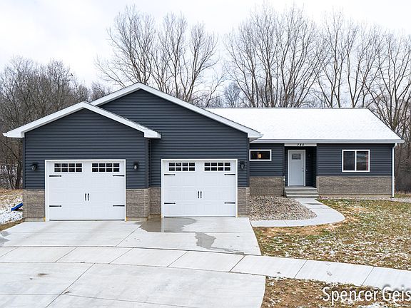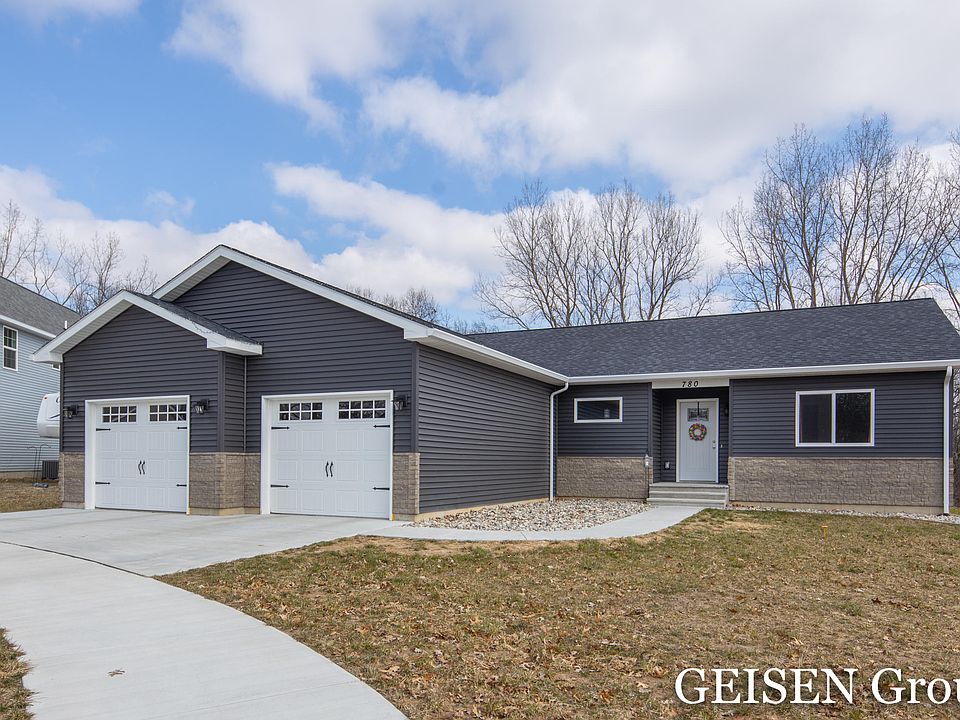 Beautiful 2018 built 4 bedroom, 3 full bath, walkout ranch offering approximately 3,148 sq' of finished living area located on over a half acre lot in a choice Belding neighborhood a short distance to a walking paths and elementary school. The level offers 1,748 sq' and features a spacious central living area, attractive white cabinet kitchen with a 4 person snack bar, walk-in pantry and dining area providing access to rear deck for grilling and relaxation. The master suite is at opposite ends of the other 2 main bedrooms and includes private pass thru bath to walk-in closet and convenient access to laundry. The lower walkout level hosts a very large and open family room, 4th bedroom plus 3rd full bath and spacious storage room separate from the mechanical area. Awesome home, priced right!