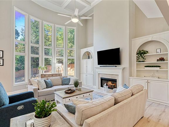 Cozy fireplaceFenced backyardSpacious primary suiteCenter islandSoaring windowsWhite kitchenSunny breakfast area