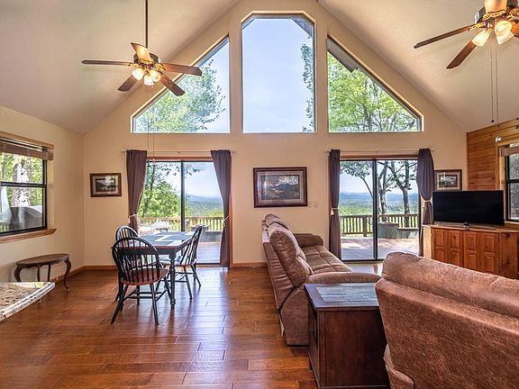 Nestled amidst towering trees and offering sweeping LONG RANGE MOUNTAIN VIEWS, this charming 2-bedroom, 2-bathroom chalet on over an acre of land promises a tranquil retreat. Step onto the expansive front porch that spans beyond the width of the house, inviting you to soak in the natural beauty that surrounds you. In the back, a spacious double-level deck provides an ideal spot to admire the mountains in all their glory. As you enter the home through two sets of sliding glass doors, you're greeted by the inviting Great Room, featuring a gas log rock fireplace, vaulted ceilings, and stunning wood floors that extend throughout the main floor. Wood walls flank the fireplace, adding warmth and character to the space. The open kitchen boasts white appliances, granite counters, and a tile backsplash, creating an atmosphere of modern rustic elegance. On the main floor, you'll find a comfortable guest bedroom with a large walk-in closet, a well-appointed bathroom, and convenient laundry facilities. Ascend the stairs to discover a loft area with a closet and another bathroom and lots of windows to bring the outside in, offering flexibile space for a bedroom, office, game room or anything you need. Outside, a crawl space underneath the house provides ample storage for your tools and more. Whether you're seeking a serene getaway or a cozy mountain retreat to call home, this chalet offers the perfect blend of natural beauty and modern comfort.