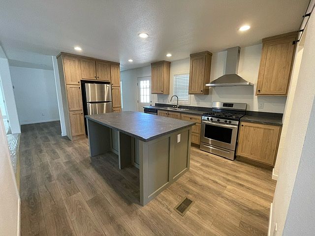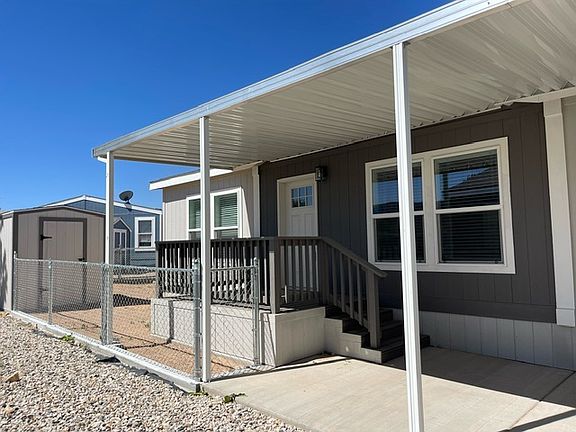 This is a brand new 2024 home with two awnings, a fenced yard, and a shed!