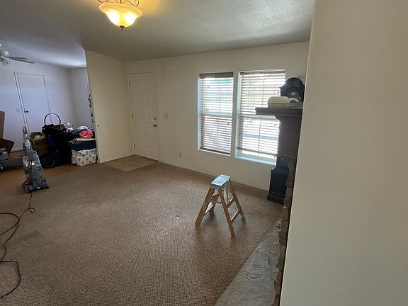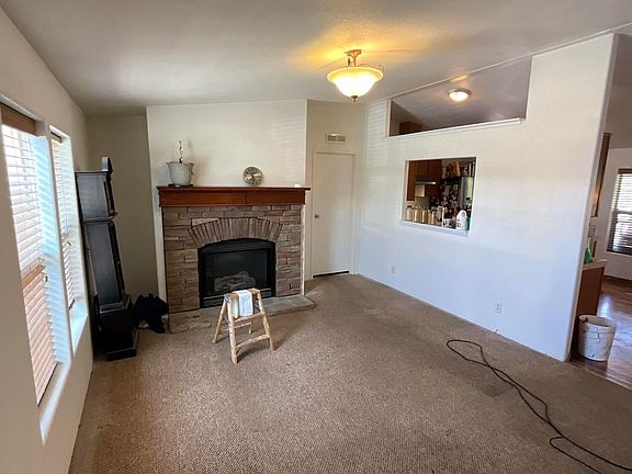 Manufactured home that has more to offer such as the double carport parking, a fully fenced yard with automatic sprinklers, large covered back deck and mountain views, a firepit area in the middle of a concrete slab and a 10x10 storage. The front living room area is a semi open floor plan with a gas fireplace and wood mantel. The right side or the large living room can be used for an office or den, this used to be a bedroom and still has a closet and window. It can be easily converted back to a 3rd bedroom.