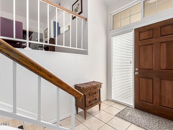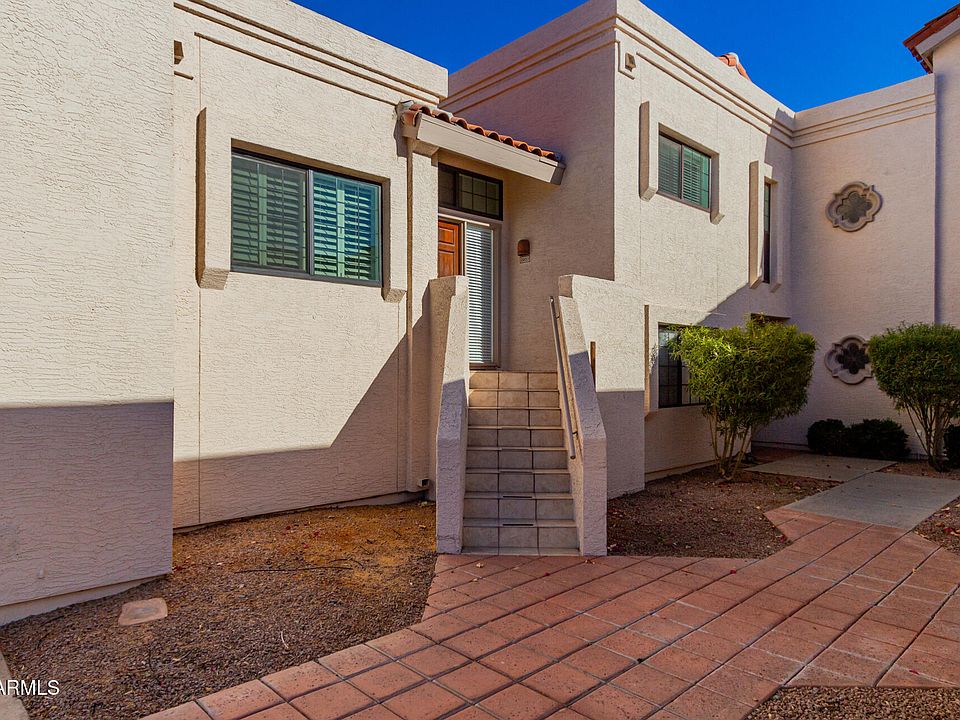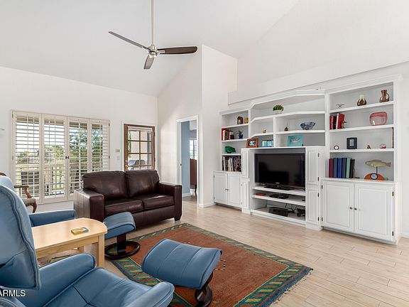 Lock-and-leave townhome in the heart of Scottsdale! This gem features vaulted ceilings, wood-look tile floors, plantation shutters, skylights, and fresh paint. The formal dining area and spacious living room with a cozy fireplace are perfect for entertaining. The kitchen boasts custom cabinets, built-in appliances, a tile backsplash, a pantry, and a convenient serving window. Retreat to the main suite with a walk-in closet and chic bathroom with dual sinks and a walk-in shower. Enjoy breathtaking mountain views from your private balcony. Located minutes from Scottsdale Silverado Golf Club, Fashion Square, dining, and more. Community pool and spa included!