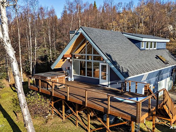Welcome to your Nordic-inspired retreat on the Hillside. Remodeled in 2021 with warm wood accents and a modern Scandinavian vibe, this A-frame showcases a dramatic south-facing wall of windows, bead-blasted pine T&G ceilings, solid pine doors, and a floating quarter-sawn oak staircase with cable railing. The European gourmet kitchen features quartz slab backsplash, paneled appliances (built-infridge + dual drawer dishwashers), double wall ovens, gas cooktop, appliance garages, and integrated storage. A sophisticated oak buffet bar with granite and glass shelving anchors the dining area. Enjoy two wood-burning fireplaces including a stunning Hope Stone hearth with live-edge cottonwood mantel plus a large primary loft suite with remote blinds and mountain views. Finished basement offers in-floor heat, den/office, separate entry with mudroom and fish-cleaning station ideal for dual living. Upgrades include Pergo WetProtect® floors, new roof & insulation (2022), stacked washer/dryer, expanded cedar deck, two sheds, RV parking potential, and partial winter Inlet views. A true Nordic gem thoughtful, modern, and surrounded by nature.