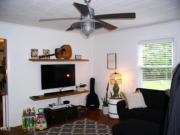 Charming bungalow on .92 acres in Wake Forest! This home offers beautiful hardwood floors in most of the main level rooms, vinyl windows, HVAC less than 5 years old, primary bedroom with private bathroom and nice size second bedroom (built-in shelving does not convey). Kitchen with ample cabinets and counter top space, laundry room/pantry just off kitchen that is open to the dining area allowing conversation for all. Upstairs you will find the bonus room and a separate room which would be a great office, arts/craft room, music room (currently used as a third bedroom). Partially fenced back yard which backs up to a wooded area for privacy. Plenty of yard space for outdoor games and ample parking on the paved driveway. Long day?? Come sit on the large front porch and relax! Convenient location to US #1, Hwy 98, 540, shopping, medical facilities and eateries.