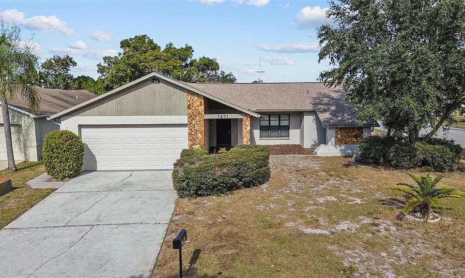 A block away from Double Hammock Creek, this beautifully renovated 3-bedroom, 2-bathroom POOL home sits on an oversized corner lot and exudes curb appeal. From the striking stone accents to the covered walkway leading to the front door, this home makes a lasting impression from the moment you arrive. Inside, high ceilings with double ceiling fans enhance the spacious living and dining area, where vinyl plank flooring flows throughout for a low-maintenance and modern touch. The kitchen is a dream with quartz countertops, stainless steel appliances, sleek white cabinetry, and a classic subway tile backsplash. The owner’s suite offers a private retreat with its own sliding glass door to the pool area, a walk-in closet, and a spa-like ensuite bathroom featuring a quartz-topped vanity, a standalone shower with floor-to-ceiling tile, and a separate soaking tub. The split bedroom floor plan ensures privacy, with the secondary bedroom conveniently located near a stylishly updated guest bathroom. An indoor laundry room just off the two-car garage adds everyday convenience. The true highlight of this home is the screened-in lanai with a sparkling in-ground pool—perfect for hosting poolside gatherings or relaxing Florida evenings. Centrally located between US-19 and Little Road, this home offers an easy commute to shopping, dining, and entertainment. Less than 10 minutes from Werner-Boyce Salt Springs State Park, you’ll have quick access to kayaking, paddleboarding, and exploring the natural beauty of the Gulf of Mexico. Don’t miss this incredible opportunity—schedule your showing today!