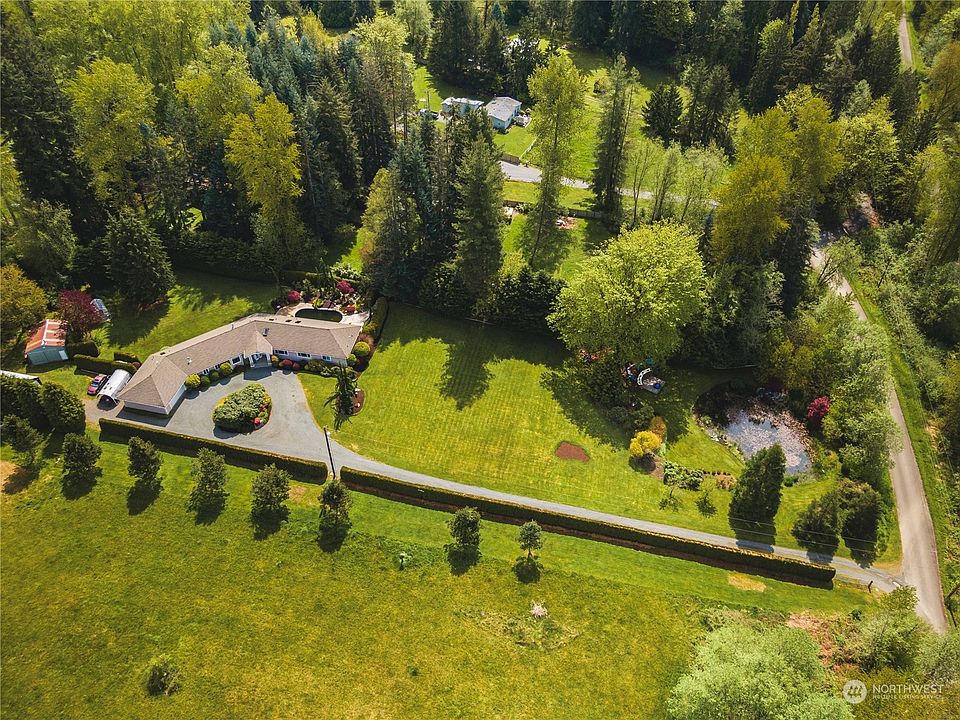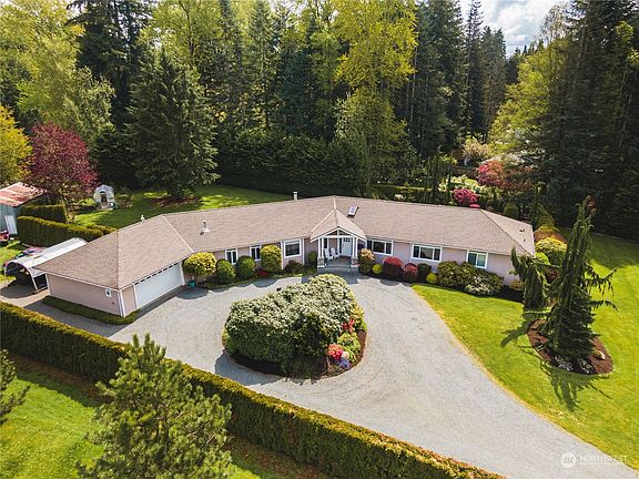 Meticulously maintained secluded estate on 3.5 acres close to Lake Stevens, Centennial Trail, & Lake Cassidy! This 3 bed/4 bath single-story home features mature landscaped grounds w/large pond, open lawns, & trails surrounding food gardens, greenhouse, chicken coop, & add'l shop. The 3,058 sqft home provides main level living with spacious primary suite, 2 add'l bedrooms w/shared full bathroom, & a flex room. Entertain in the open kitchen w/large island, formal dining room, & walk out to the backyard garden w/koi pond, waterfall & spacious deck for enjoying the south sun exposure in a peaceful setting. The East part of property provides multiple uses including potential expansion space for accessory dwelling and separate driveway access.