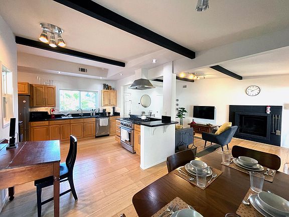 Manicured flower-filled front gardenWell-stocked kitchenWasher and dryerVaulted ceilingsLed tv