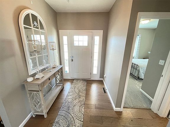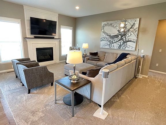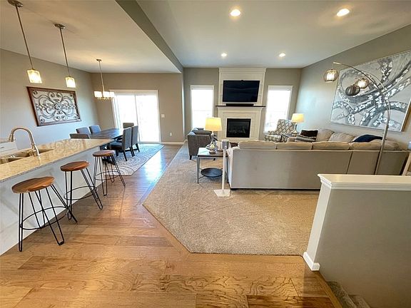 No stairs to the entrance or from the 3 car garage with EV charging in this zero entry, walk-out ranch home! Engineered hardwood flooring greets you in the mud room entrance from the garage or from the covered front porch into the foyer that leads to the 10' tray ceiling almost 19' X 16' great room with gas fireplace flanked by windows. Open concept kitchen with engineered hardwood flooring, staggered height white cabinets, quartz countertops, tiled backsplash, large island breakfast bar and generous dining area with access to the deck which steps to the backyard. Fabulous spacious primary ensuite with 9' tray ceiling, pocket door to dual sink vanity with storage tower, glass shower doors step in shower and delightful walk-in closet with transom window. Generous sized second and third bedrooms. Additonal full baths in both the main and lower level, also with shower doors. Step saving main floor laundry room with washer & dryer remaining. Super-sized family & rec room space in the walk out lower level. Plenty of storage for your treasures, too.