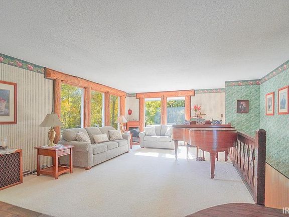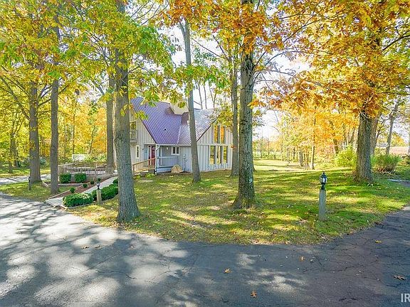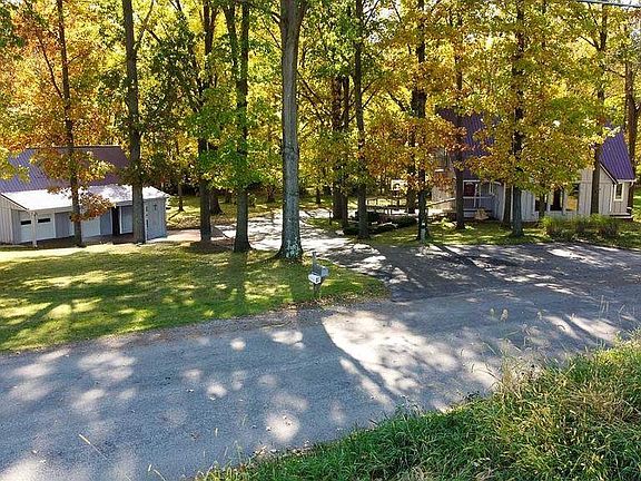 This charming home is situated on 6.3 acres of land, with a picturesque wooded area and a serene creek at the back of the property. The A-frame, vaulted ceiling design boasts a beautiful dining room and kitchen with large windows, and an attached sun room, providing natural light and scenic views. To add a touch of rustic elegance, the house features intricate wood framing, siding, beams, a balcony, and a deck with built-in seating. Additionally, there's a finished basement, a spacious detached garage with a loft for extra storage, and a wood-burning stove for cozy warmth on colder days. Updates include an HVAC and metal roof.
