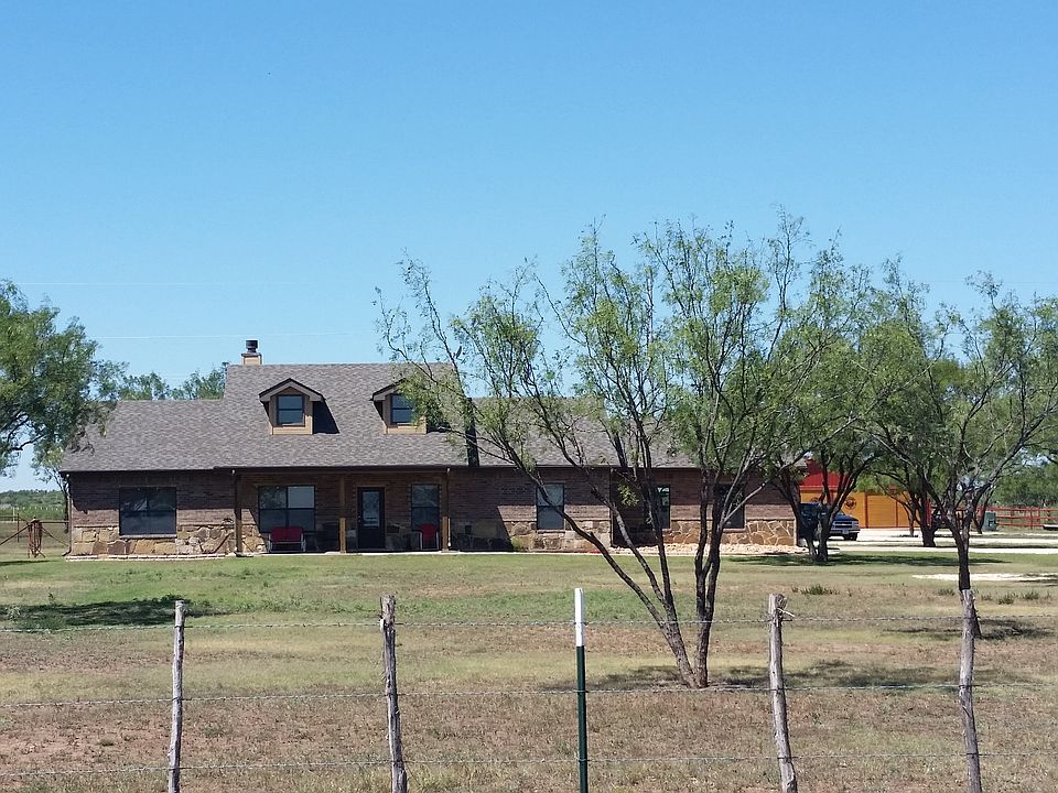 Brick/stone home on 5 acres with vaulted ceilings, crown molding recess ceilings,wood burning fireplace with a blower. jetted tub, storage building and a beautiful barn with tack room and pens .Rv hook up . New tile. Call or text for more info 325-660-7700