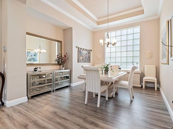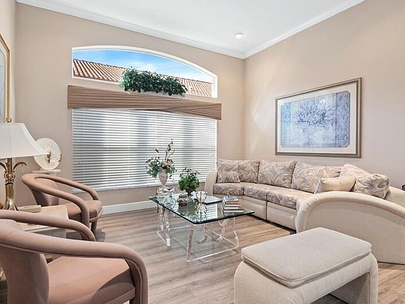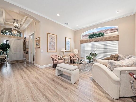 Your search for a remodeled, truly turn key home is over. As you enter this bright, light-filled 3br/2.5ba property, you are immediately struck by the home's soaring ceilings and upgrades. High-end, wood-like laminate floors, new baseboards, crown molding, and LED lighting are found throughout. The chef's kitchen boasts upgraded appliances (including brand new electric range and microwave), granite countertops and island, custom tile backsplash, as well as expanded custom cabinetry with stainless steel double level drawers and a well lit, oversized pantry. The kitchen includes a bright breakfast nook with bay window and is open into the spacious living room. The home's master retreat boasts beautiful coffered ceilings, corner light, and two built out, customized walk in closets. The master bath offers double sinks, overlaid medicine cabinets, a roman tub, and separate shower with frameless glass door. The entire rear of the home opens onto a spacious, screened in patio with motorized awning allowing for true indoor/outdoor living. The home's formal living and dining rooms boast large windows and coffered ceilings. Heavy duty tinting and silicone sealant borders are found on all windows for energy efficiency. Even the home's garage is updated with built-out shelving and a newer refrigerator (2017) and Chamberlain garage door opener (2019). The laundry room boasts a newer washer (2018) and dryer (2019), as well as a utility sink. A Stiebel Eltron tankless hot water heater was added in 2020. The HOA dues include painting of home exteriors, cable, hi-speed internet wifi, security system, lawn maintenance, and 24 hr manned gates. Valencia Shores is a luxurious, non-membership 55+ community with countless amenities including two stunning clubhouses. The 34,000 square foot Social Clubhouse boasts a beautiful welcoming lobby, card rooms, arts and crafts, billiards and a social hall with dance floor and raised stage for headliner performances. The Social Clubhouse includes a resort-style pool with an oversized deck and shaded cabanas, along with a resistance pool. The second clubhouse--the Athletic Clubhouse--offers a state-of-the-art fitness facility, racquetball, pickleball, basketball, an aerobics studio, and tennis courts, all focusing on health and wellness.