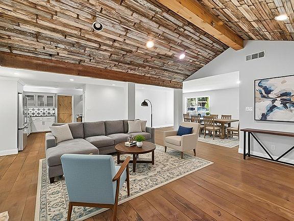 - Description: Wide plank reclaimed wood flooring throughout the main living/dining/den open space.