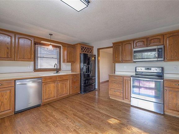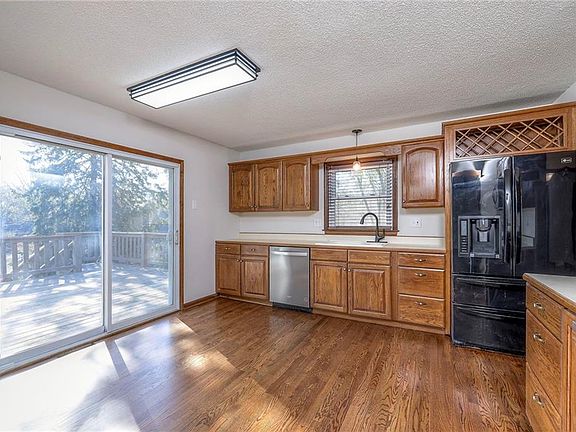 RARE FIND in Lenexa! This spacious 4-bedroom ranch/1.5-story with 4 CAR GARAGE home is tucked away on a CUL-DE-SAC in a well-maintained and highly sought-after neighborhood! The main level offers a smart and functional layout with 3 bedrooms and 2 full baths, including a remodeled primary bath. Upstairs, you’ll find a private 4th bedroom—perfect for guests, a home office, or quiet retreat. The kitchen could easily be opened up to the family room for a more open floor plan. The generous lower level features a stunning brick fireplace and is ready to finish exactly how you want it. Recent updates include a new roof, gleaming refinished hardwoods, fresh interior paint, new carpet, stainless steel appliances and more.