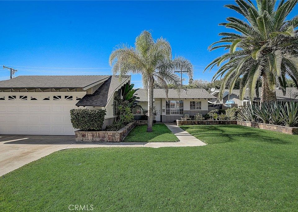 Beautiful North Orange County single level, 4-bedroom, home features fresh new white bright tones, ceiling fan and new carpet makes for an elegant space. The living room boasts a white brick fireplace, built in bookcase, an adjacent dining area with chandelier and large windows that allow an abundance of natural light to illuminate the open floor plan throughout. The spacious family room has gorgeous wood beamed ceiling, a red brick fireplace and custom shutters. The kitchen has a large countertop island with high bar stool seating, plenty of cabinets, countertops and storage. The appliances include a gas range, single oven, dishwasher and refrigerator. The primary bedroom ensuite features tall mirror wardrobe closet doors, new carpet, blinds and a half bathroom with single sink vanity. The two secondary bedrooms have new carpet, blinds and tall mirror wardrobe closet doors. Down the hall is a three-quarter bathroom with floor to ceiling stone-tile step-in shower. The fourth bedroom with tile flooring, closet and slider to the backyard can be used as guest room, den or laundry room. Relax in the backyard with a covered patio, grassy area, planters for gardening, mature fruit trees, side yard with covered patio and a shed. The beautiful front yard welcomes you with well-manicured green lawn, professionally landscaped yard and a front porch area for quiet time. A two-car garage and extended driveway are perfect extra parking. New roof, new water heater and includes water osmosis system under the kitchen sink. This home is on a cul-de-sac in an established neighborhood. Nearby shopping, restaurants, Buena Park Mall, Knott Berry Farm, easy access to the 91 and 5 freeways. No HOA. Must see this home!