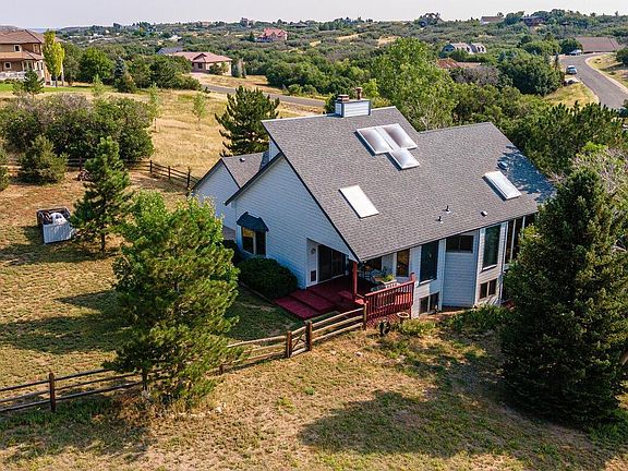 Take a deep breathe and exhale. This relaxing country home setting is yours to come to. 2.25 acres with a seasonal creek running through it. Grass and treed areas to fulfill your walking and nurturing needs. Only a half mile walk to the Castle Pines shops, restaurants, clinics, Douglas County Library, Douglas County Montessori school. Only 5 miles to the Meridian, Inverness or DTC office parks. Four miles to the Ridgegate Light Rail. The Sellers, who have lived here many years, just replaced roof and front gutters, the septic tank, and the hot water boiler system! Also, the house's interior cathedral ceilings have been freshly painted! The exterior has also just been sealed and painted. New upgraded carpet has just been installed! The Main floor Principal bedroom and bath suite is incredibly convenient. Included is a large adjacent fenced in area off the back patio. Come explore and relax with private spaces all around. Three bedrooms down and a hot tub area. A cathedral loft area that makes a great office with loads of space. Inside storage space in the basement and outside storage galore in the oversized garage. ***This is not a horse property - Charter Oaks is a wildlife corridor with no fences