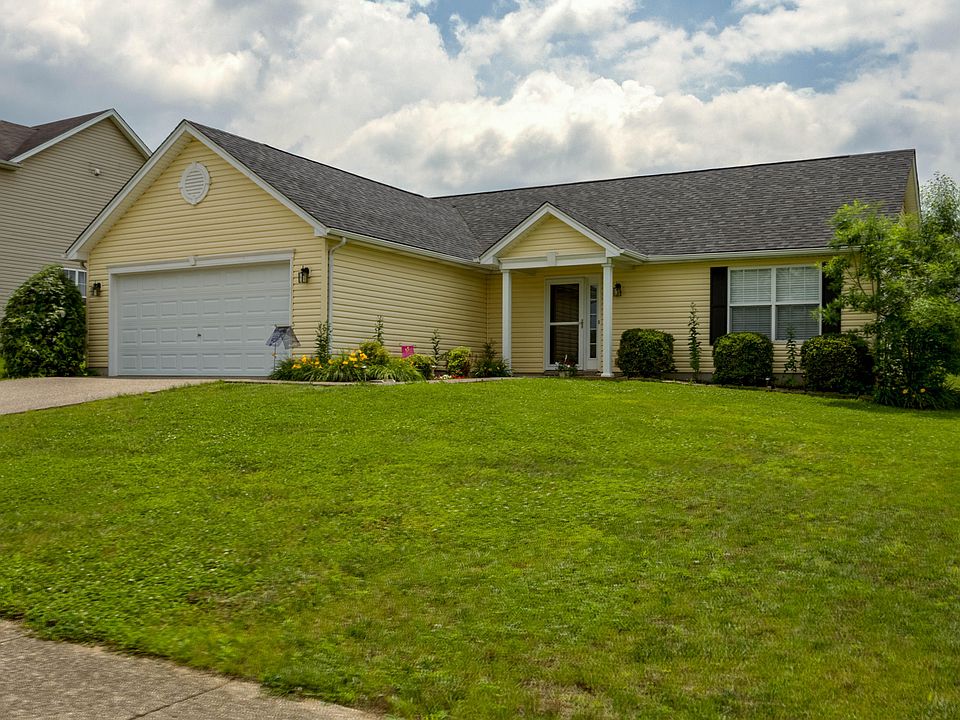 Cheerful ranch home is tucked in the back of the peaceful Bridlewood subdivision, well-maintained and ready to move right in! Amenities of this lovely home include a welcoming entry, open concept split floor plan with a large master ensuite with walk-in closet on one side of the house and two additional bedrooms and a full bath on the other side. A large kitchen with breakfast bar and lots of cabinet storage, dining area and vaulted great room with fresh paint and the carpets have been professionally cleaned. Conveniently located near Jefferson Mall, several school options and I-65.