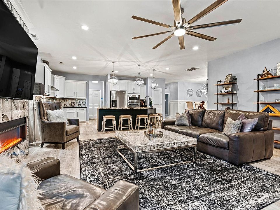 Welcome to 7809 Creek Park Drive — where thoughtful design and modern comfort come together. This 3-bed, 3-bath home with 2,552 sq ft offers an inviting layout with the primary suite conveniently on the main level. Inside, you’ll find custom wall moldings, stylish lighting, and a stunning 6-ft modern fireplace anchoring the open living space. The kitchen features a Carrara marble backsplash and designer finishes that make it feel one-of-a-kind.