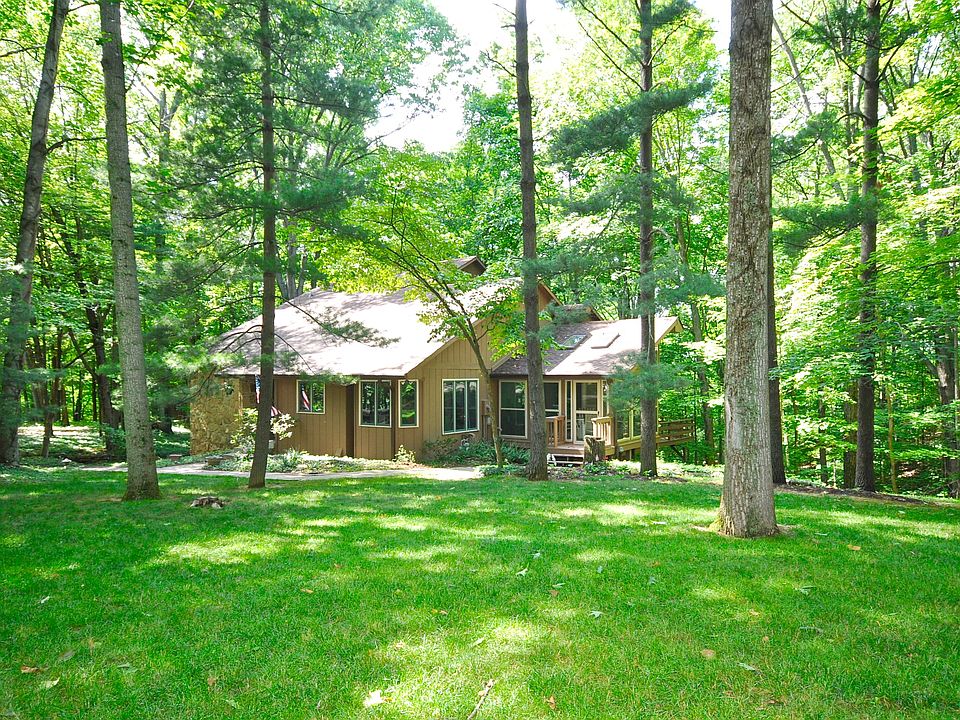 Your lakefront retreat in the woods with a dock on beautiful Lamb Lake. Enjoy living in park like setting with a gorgeous sunroom and deck to take in the woods and the wildlife. Kitchen with Jenn-Air range in center island and bay window with window seat. Large dining room with wet bar and built-in fridge overlooks sunken living room with Brown County stone fireplace. Huge master, walk-out basement, built-in garage. Wonderful views.