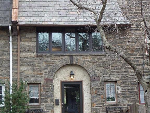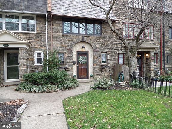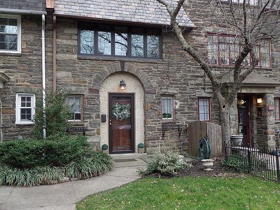 The traditional design, reminiscent of a Philadelphia brownstone, where the stone exterior combines with the ageless aesthetic appeal of the arched stonework framing and accenting the front door plus a slate shingle pent roof will take you a step back in time. A front stone wall grants entry to the walkway which leads comers past the front yards where landscaped perennial gardens add to the effect of an "Olde English" style walled garden courtyard. This circa 1925 townhome presents the melding of modern amenities & improvements with original character which has been lovingly and diligently maintained. Original features include: deep window sills, plaster walls, corner brick fireplace comingle with the list of improvements: casement replacement windows, new larger gas hot water heater, converted from oil heat to gas , remodeled kitchen replacing counters, adding subway tile backsplash, new gas self-cleaning range, annual roof maintenance & more! The welcoming foyer greets all who enter and hardwood flooring guides you down the hall to the generously sized family room designed for relaxed entertaining. A built-in wet bar and entertainment cabinet await your personal choices for seating arrangements, to fully enjoy all your video/media and music equipment and maybe a surround sound system too. A conveniently located powder room is adjacent to the family room. Be sure to notice a coat closet as well as storage & utility closets are neatly tucked away. A step down off the family room we find the laundry/mud room with outside entry from private parking in the carport and driveway. Ascending the steps from the entry foyer to the main living level where an open concept floor plan dramatically multiplies the spaciousness of this warm & inviting living area. Lustrous hardwood flooring ebbs & flows throughout this space connecting the rooms magnifying the ~great Room~ effect. The combined light filled area measures approximately 30~ x 15~ where natural light cascades throug